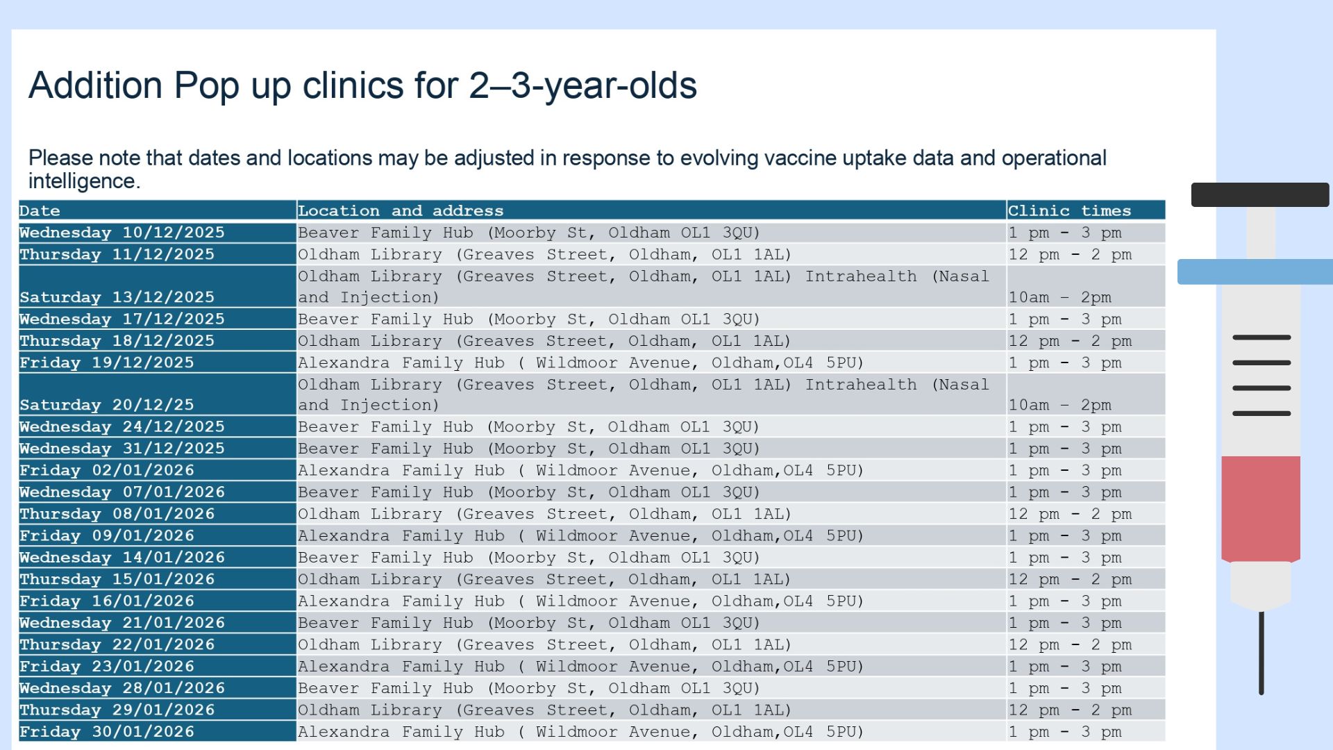 Drop-in flu vaccination clinics for children aged 2 and 3 years are now available across Oldham. These sessions do not require an appointment and are designed to make access as easy as possible for families.